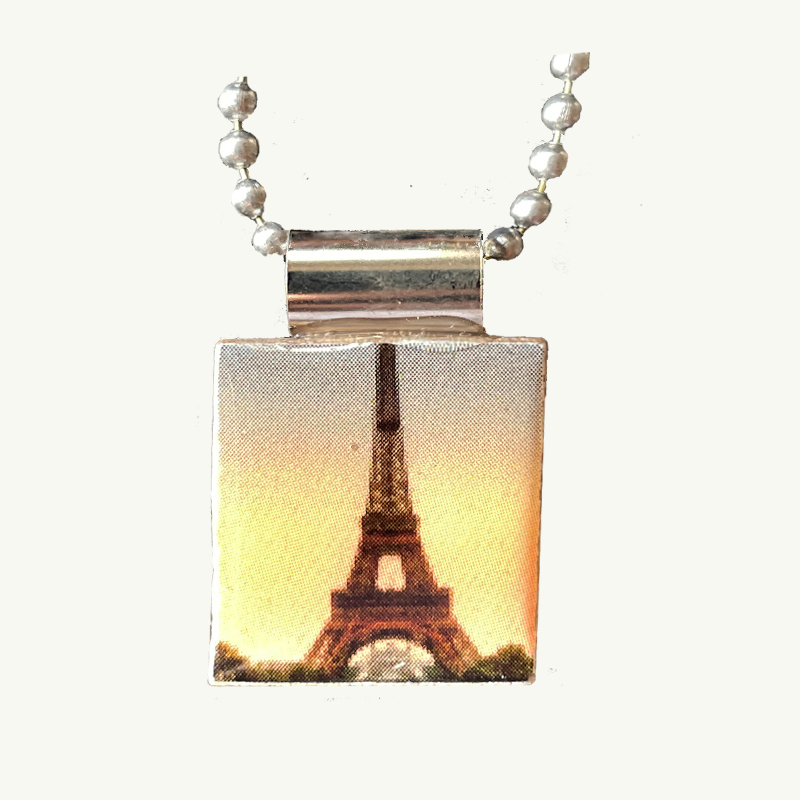Eifel Tower Scrabble jewelry uses a vintage Scrabble piece as the backing for this fun motto from the west and bicycle riders was handcrafted in Washington state! Artwork is hung on a stick and ball chain that can be adjusted. You can wear the Scrabble piece or photo to be seen depending on your mood!