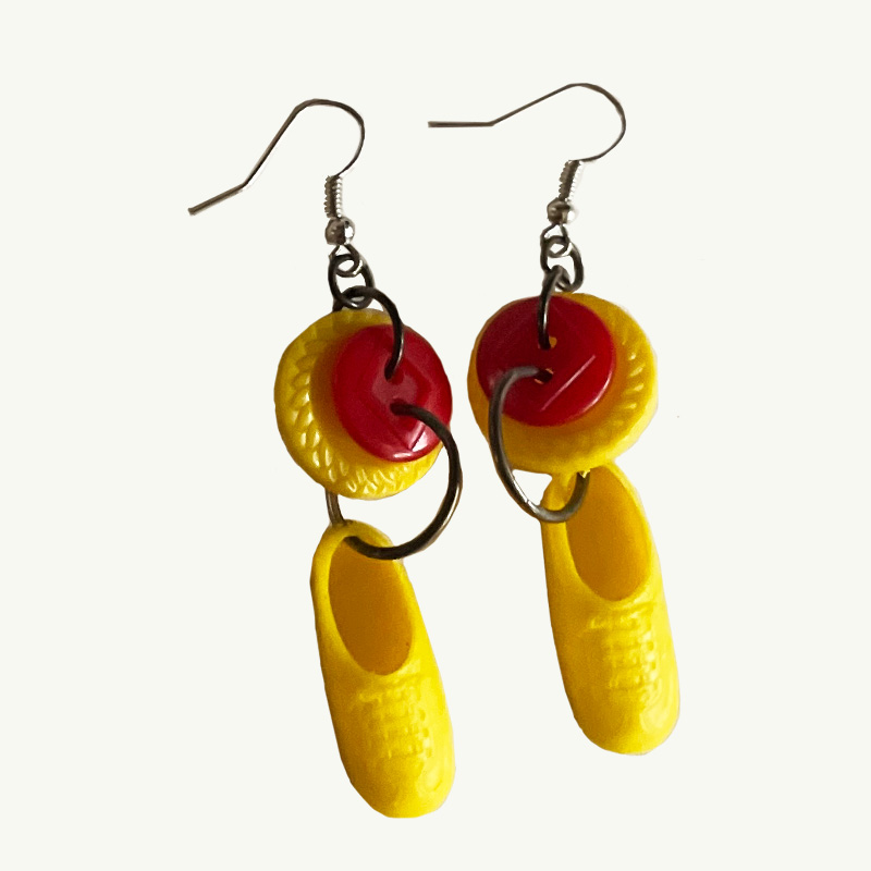Bright yellow Barbie tennis shoes with yellow and red buttons make up these fun earrings by Lori Kirsch. Barbie shoes are dressy while still a touch of whimsy creating a fun all overlook. Earrings have a 2.5″ drop!