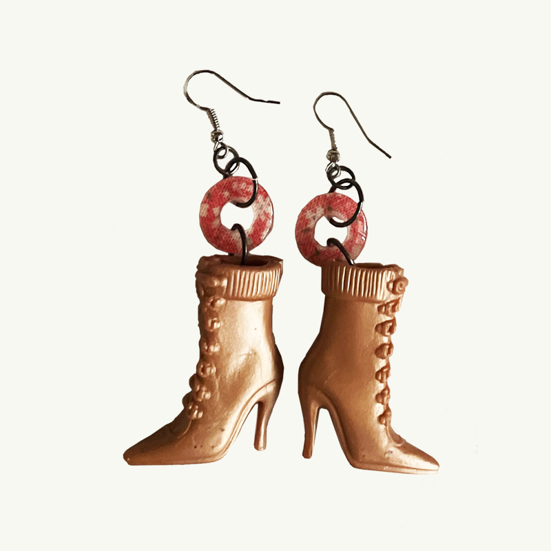 Gold Victorian Barbie boots with red and pink buttons make up these fun earrings by Lori Kirsch. Barbie shoes are dressy while still a touch of whimsy creating a fun all overlook. Earrings have a 3″ drop!