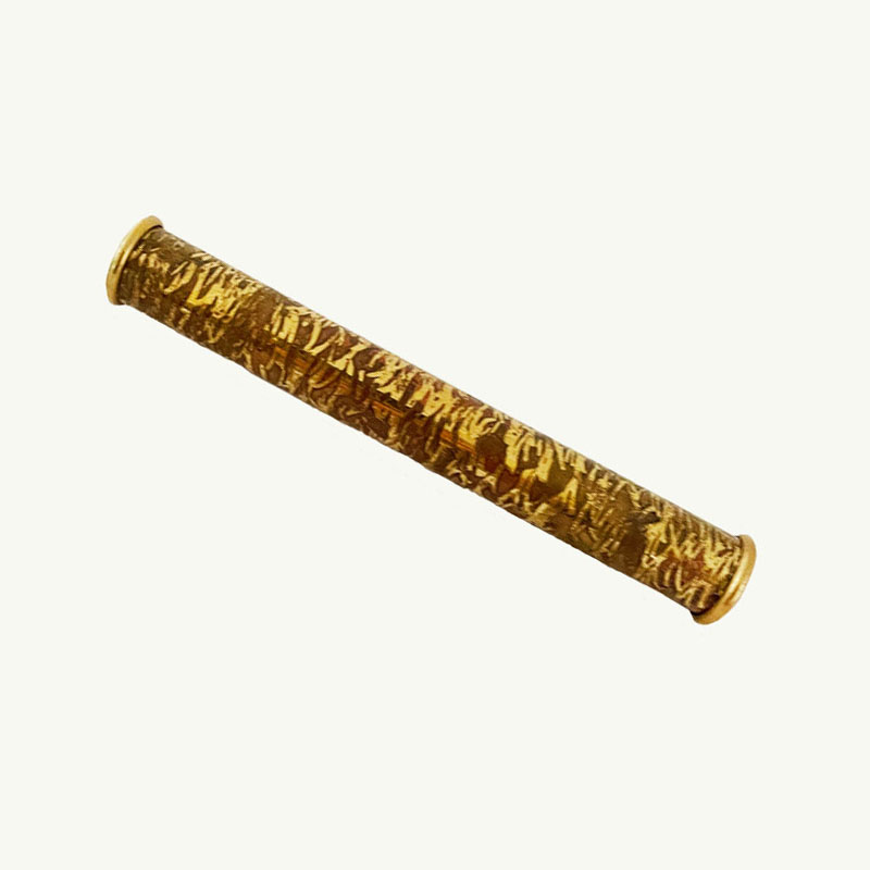 Small brass hand held scope by kaleidoscope artist Scott Cole has unique etched design on the body of scope that was crafted by Scott. This beautiful as well as fun scope has a 3 mirror system and is from a series of brass etched scopes created for Art Of Toys in 2016. 3/4x 5 1/2”